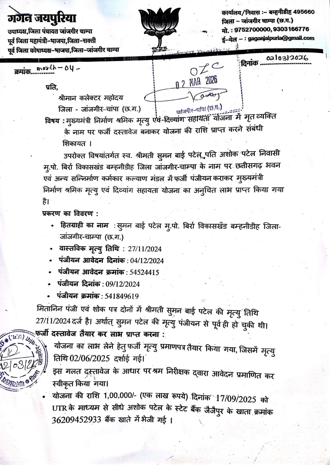 जांजगीर-चांपा के उपाध्यक्ष गगन जयपुरिया ने मुख्यमंत्री निर्माण श्रमिक मृत्यु एवं दिव्यांग सहायता योजना में लाखों रुपये के फर्जीवाड़े का गंभीर मामला उजागर किया है। इस संबंध में उन्होंने जिला कलेक्टर एवं पुलिस अधीक्षक को लिखित शिकायत सौंपते हुए पूरे प्रकरण की उच्चस्तरीय जांच की मांग की है।