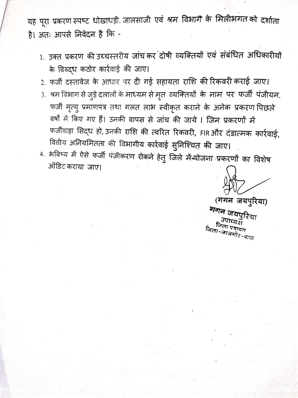 उन्होंने दोषियों के विरुद्ध FIR दर्ज कर कठोर कार्रवाई, राशि की रिकवरी तथा जिलेभर में योजनाओं की विशेष जांच एवं ऑडिट कराने की मांग की है।