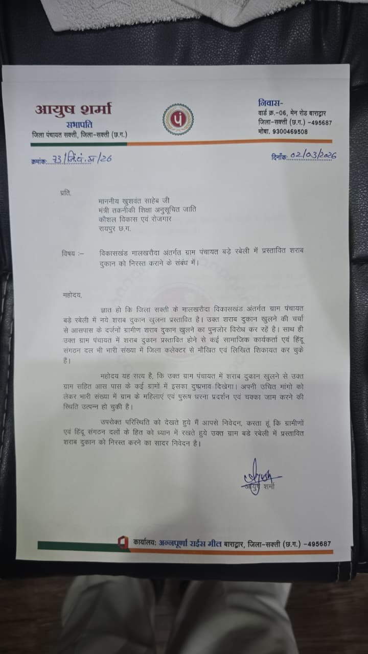 सक्ती। विकासखंड मालखरौदा अंतर्गत ग्राम पंचायत बड़े राबेली में प्रस्तावित शराब दुकान को लेकर विरोध लगातार तेज होता जा रहा है। इसी कड़ी में जिला पंचायत सक्ती के सभापति आयुष शर्मा ने रायपुर स्थित प्रभारी मंत्री गुरु खुशवंत साहेब के निवास कार्यालय पहुंचकर उनसे मुलाकात की और शराब दुकान को निरस्त करने की मांग करते हुए आवेदन सौंपा।