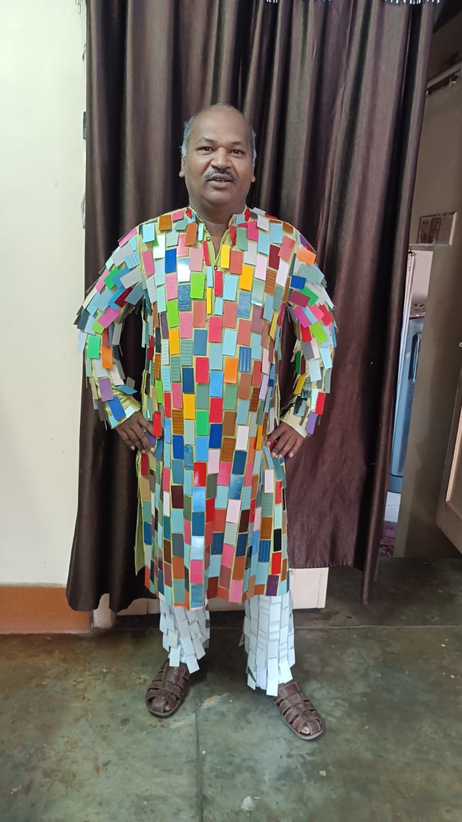 इसी बात को ध्यान रख इस बार रंग बिरंगे सनमाईक फोरमाईक जो फर्नीचर बनाने में उपयोग होता है उसको एक साईज की पीस कटींग कर ड्रेस तैयार कर पहन कर नगर में भ्रमण करते नजर आये।