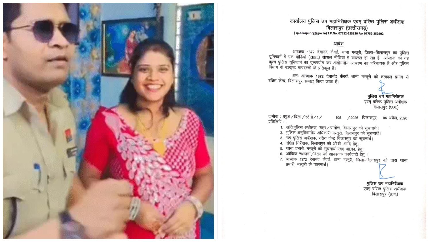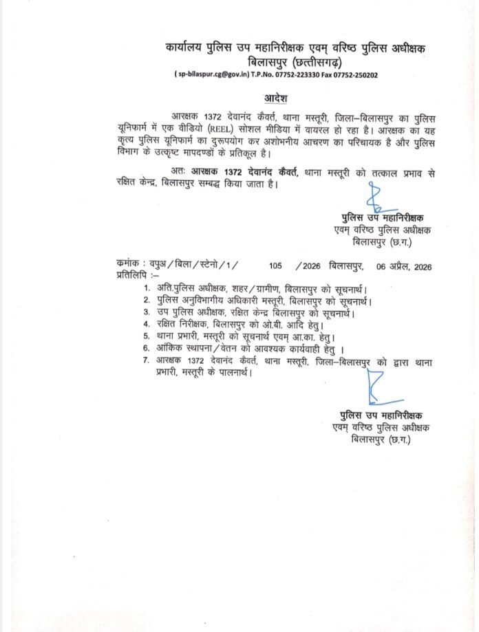 बिलासपुर/- छत्तीसगढ़ के बिलासपुर जिले में पुलिस वर्दी में डांस कर सोशल मीडिया पर वीडियो पोस्ट करना एक आरक्षक को भारी पड़ गया। मस्तूरी थाने में पदस्थ आरक्षक देवानंद कैवर्त्य ने अपनी पत्नी के साथ ‘हाय रानी, हेलो रानी’ गाने पर डांस करते हुए वीडियो बनाया और उसे इंस्टाग्राम पर शेयर कर दिया, जो देखते ही देखते वायरल हो गया।